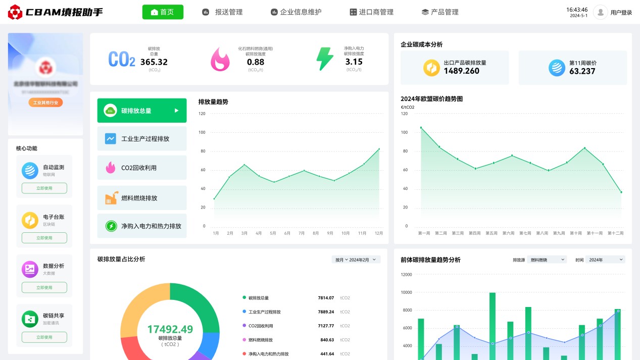 2023年10月1日起,歐盟碳邊境調整機制(CBAM)已進入過渡期,CBAM涵蓋范圍的出口產品需按時提交產品碳排放報告,未提交報告的企業將面臨高額處罰。為解決企業由于官方政策文件理解難度大,專業門檻高,數據搜集難度大,部分數據缺失無法填等困擾,推出碳關稅管理平臺(CBAM填報助手),通過數字化方式,為企業提供碳數據填報、碳數據核算、碳數據報送、碳數據認證、咨詢培訓等全流程服務??蓸O大減少企業碳排放報送門檻,助力企業低成本合規報送碳排放數據。
